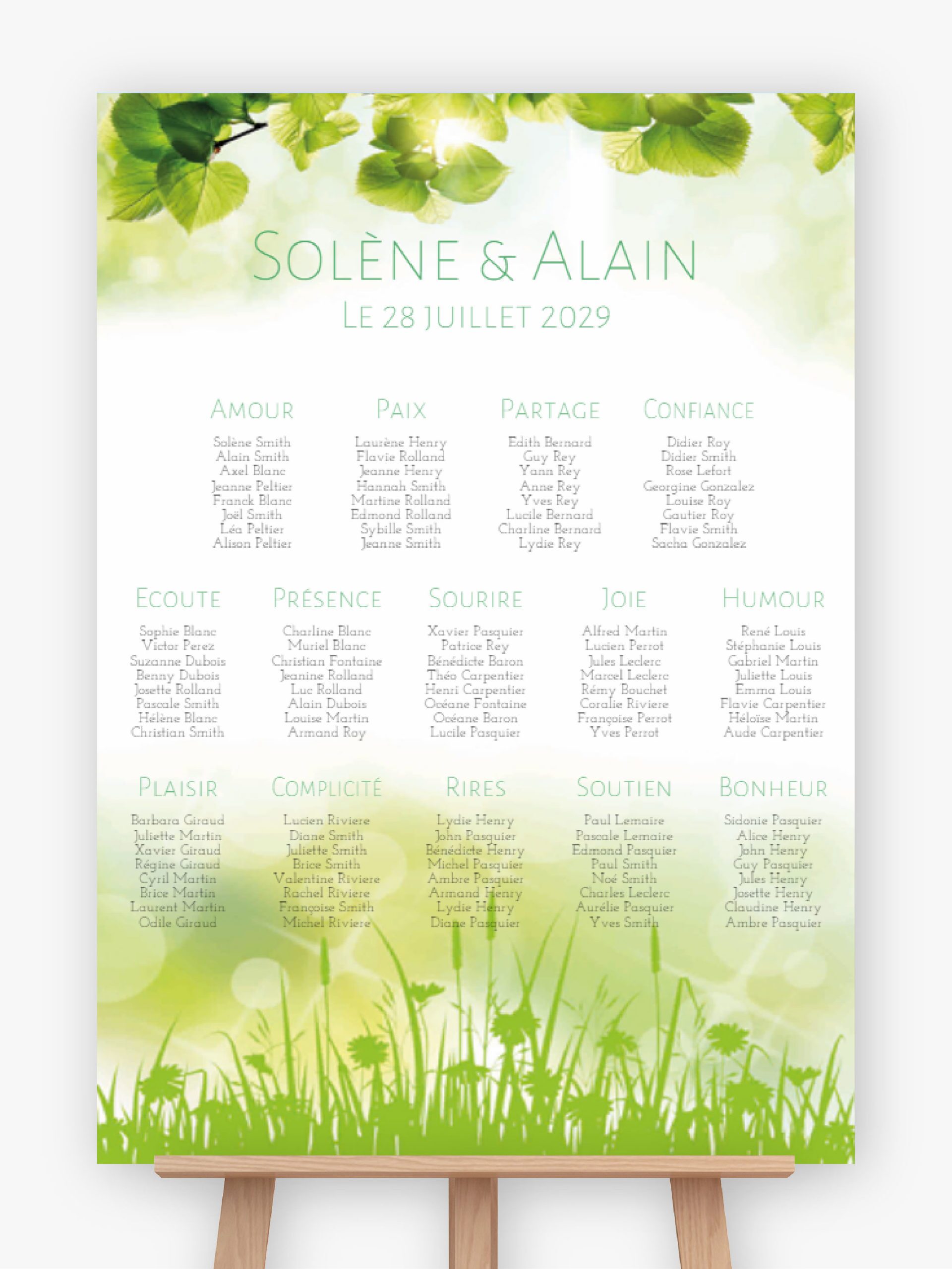 Le plan de table mariage « Printemps été » met en avant le thème de la nature, du soleil, des feuilles et des arbres. Une composition très fraîche et agréable pour donner une identité unique à votre événement.